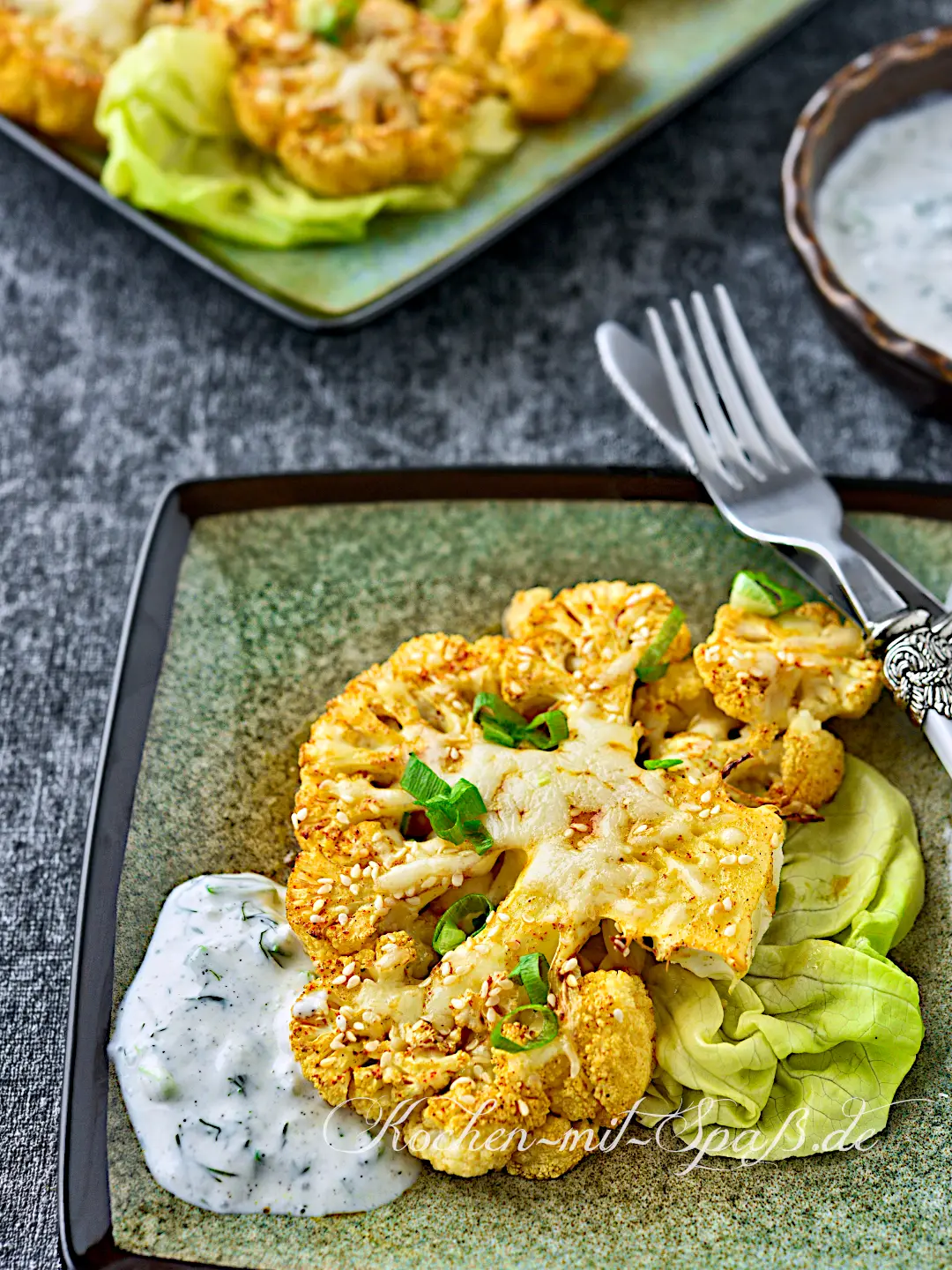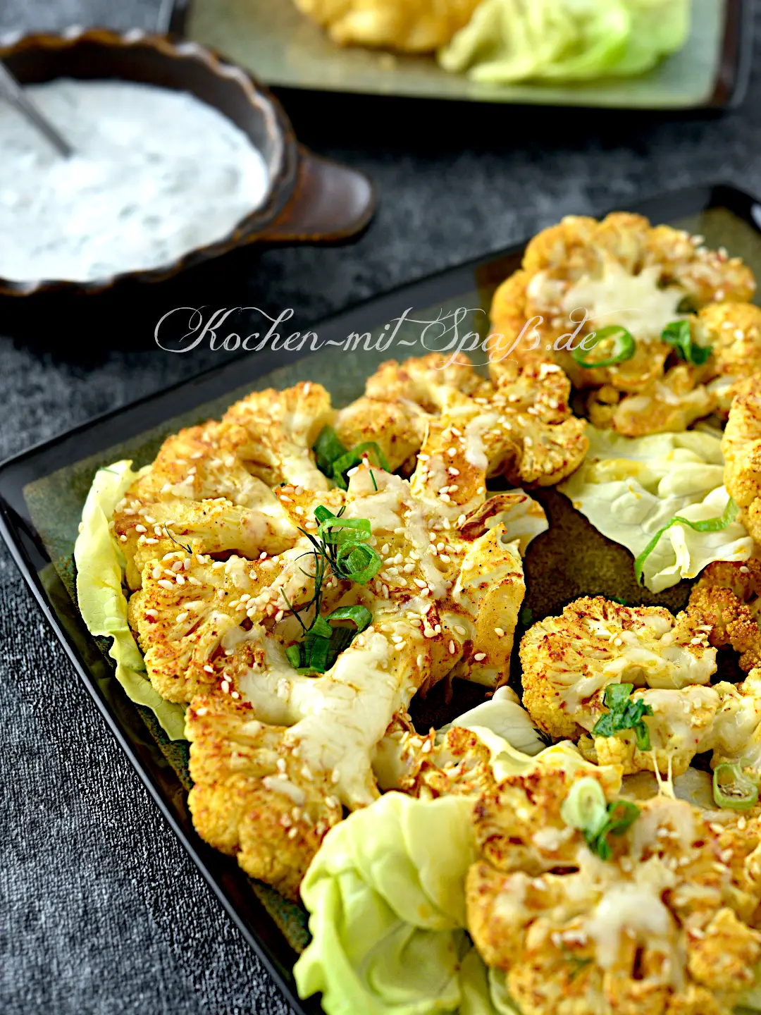 Die angegebenen Gewürze für die Marinade sind nur Beispiele. Ihr könnt experimentieren und sie nach Belieben verändern. Auch das Bestreuen des Blumenkohls mit Sesam und Käse ist optional, je nach Geschmack.