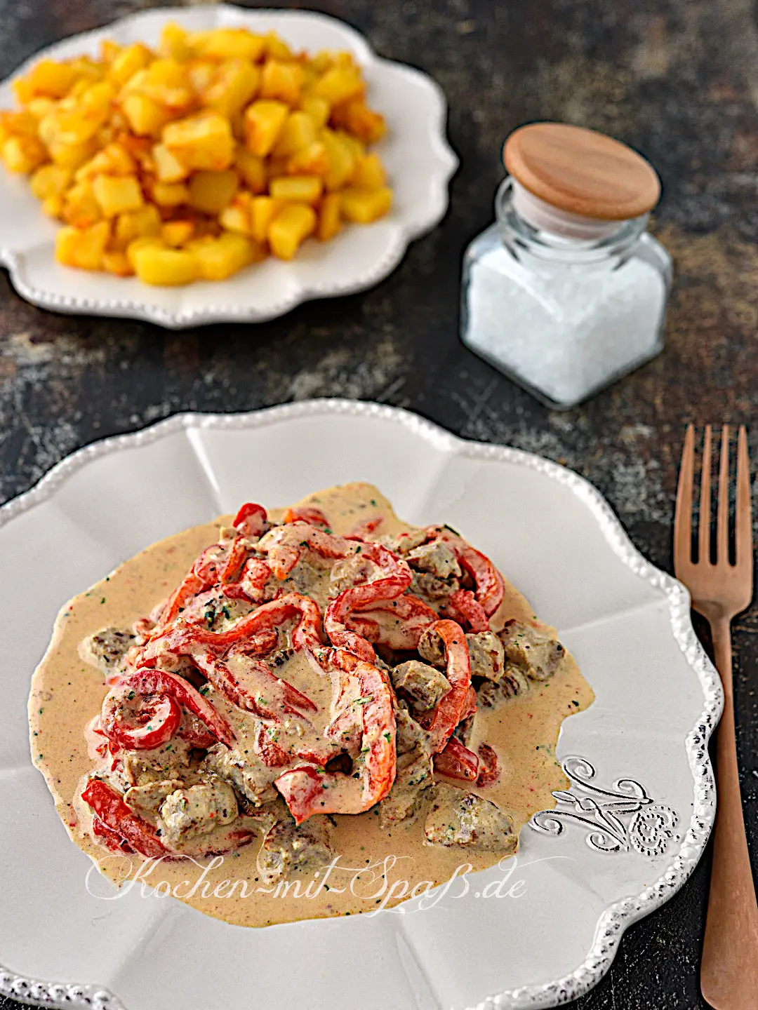 - Zum weichen Fleisch die Sahne geben und ohne Deckel bei mittlerer Hitze ca. 5 Minuten kochen lassen. Mit Salz, Pfeffer und Paprikapulver abschmecken. Zum Schluss die kalte Knoblauch-Kräuter-Butter sowie die Paprikastreifen unterrühren.