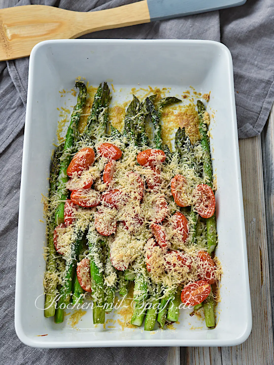- Im vorgeheizten Backofen bei 200°C (Ober- Unterhitze) etwa 20 Minuten backen, bis der Parmesan goldbraun ist und der Spargel weich, aber noch bissfest bleibt.