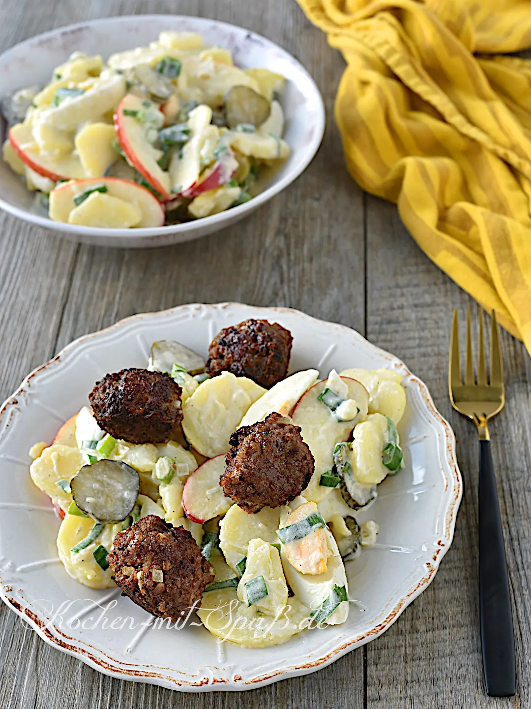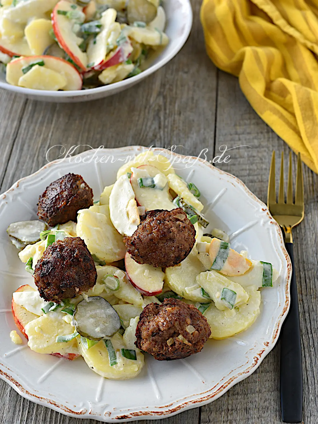 Die Zutaten machen den Salat nicht nur aromatisch, sondern auch besonders sättigend: Apfelscheiben sorgen für eine frische, leicht süß-säuerliche Note, während kleine Frikadellen daraus eine vollwertige Mahlzeit machen. Der Kartoffelsalat mit Frikadellen eignet sich perfekt als Abendessen, als Lunch fürs Büro, als leichtes Mittagessen oder für ein gemütliches Familienessen, wenn man etwas Einfaches, Leckeres und zugleich Besonderes servieren möchte.